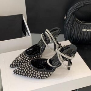 A sleek and stylish pointed-toe heel, adorned with shimmering faux silver rhinestones and a delicate silver strap for a touch of feminine elegance.
