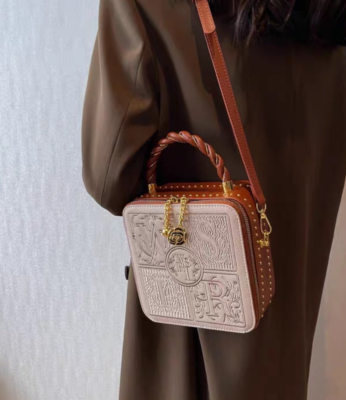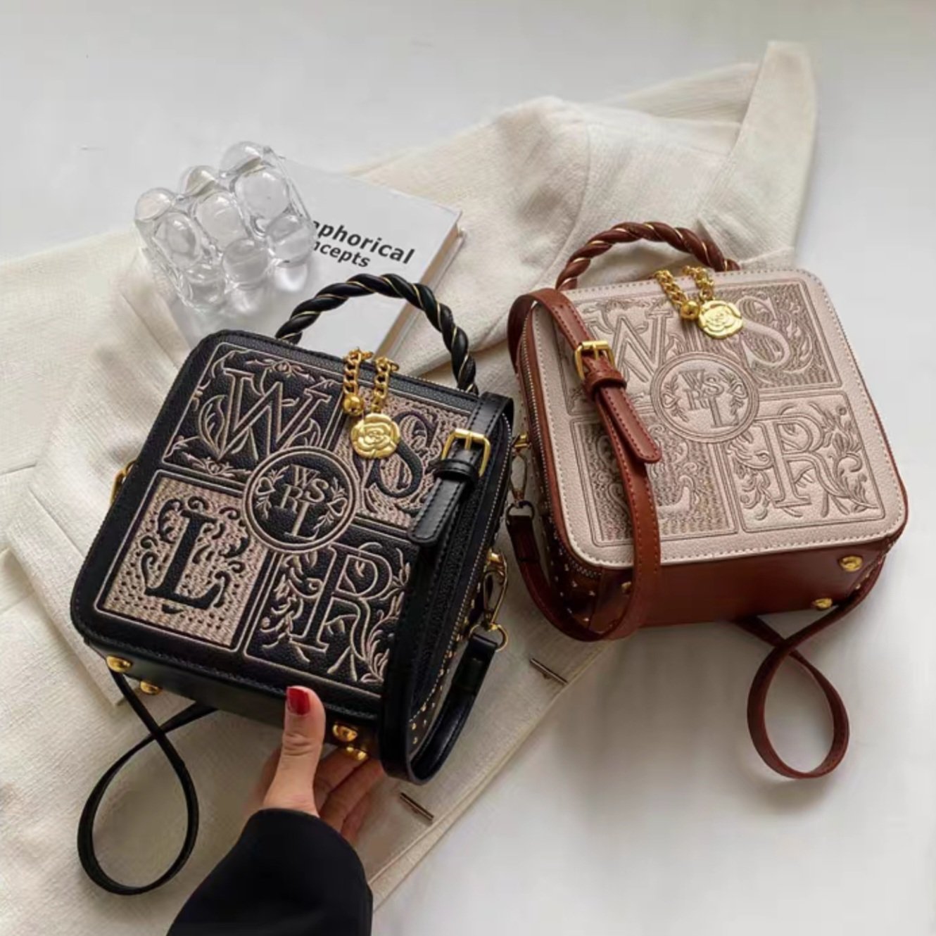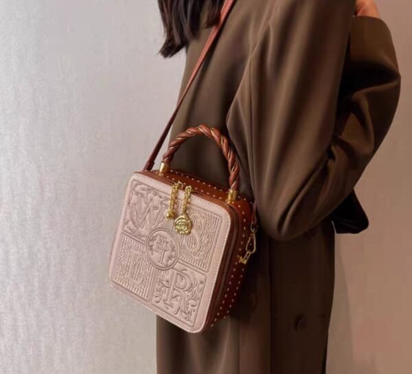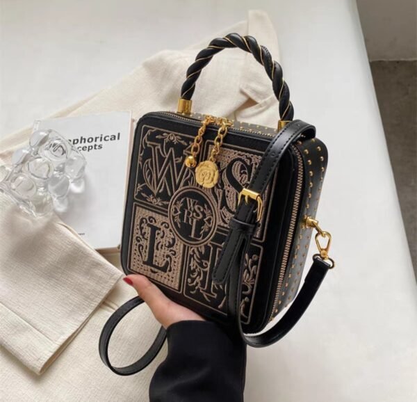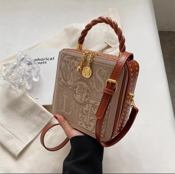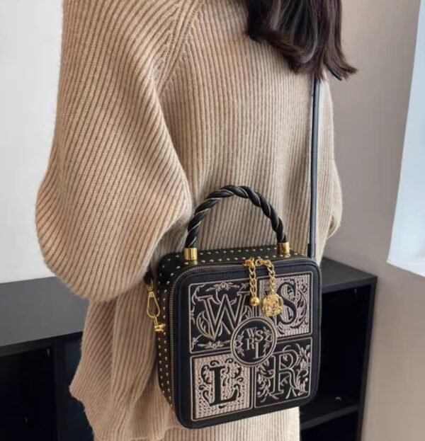 You can wear it as a shoulder bag or a crossbody bag, based on your preference. Additionally, it features a handheld strap for those moments when you want to carry it like a classic handbag. The box-shaped handbag stands out with its unique embroidery-like letters design, giving it a sophisticated and trendy look. The zipper ensures your belongings are securely stored, making it both stylish and practical.