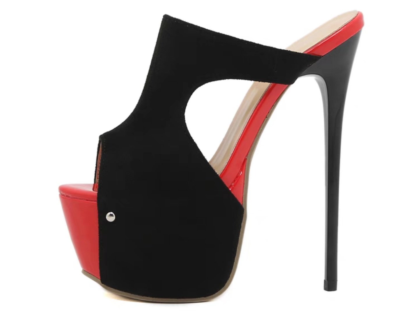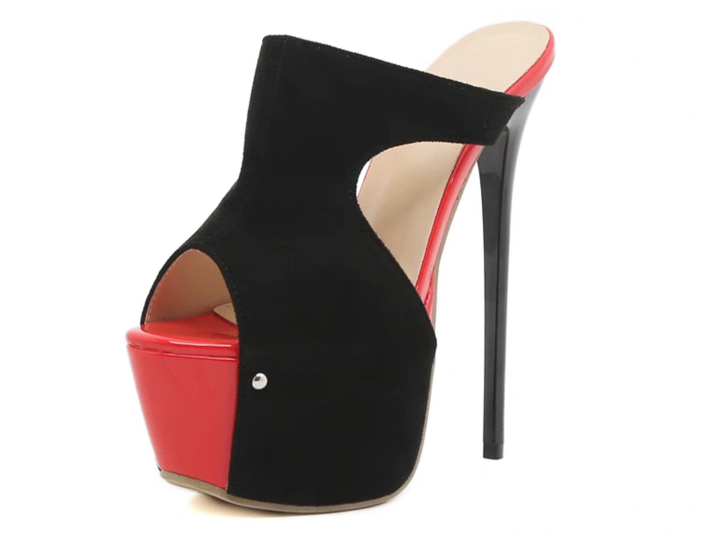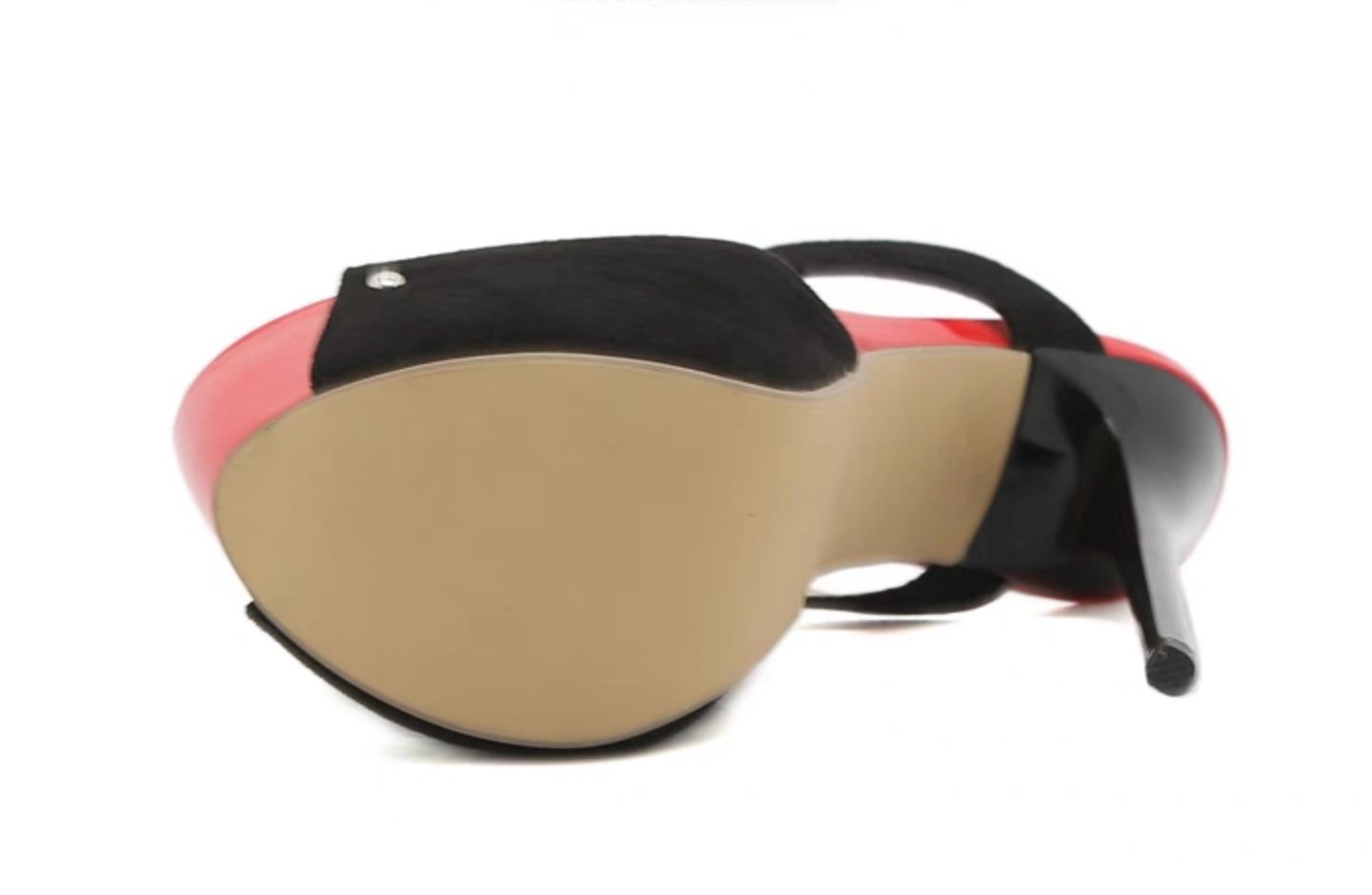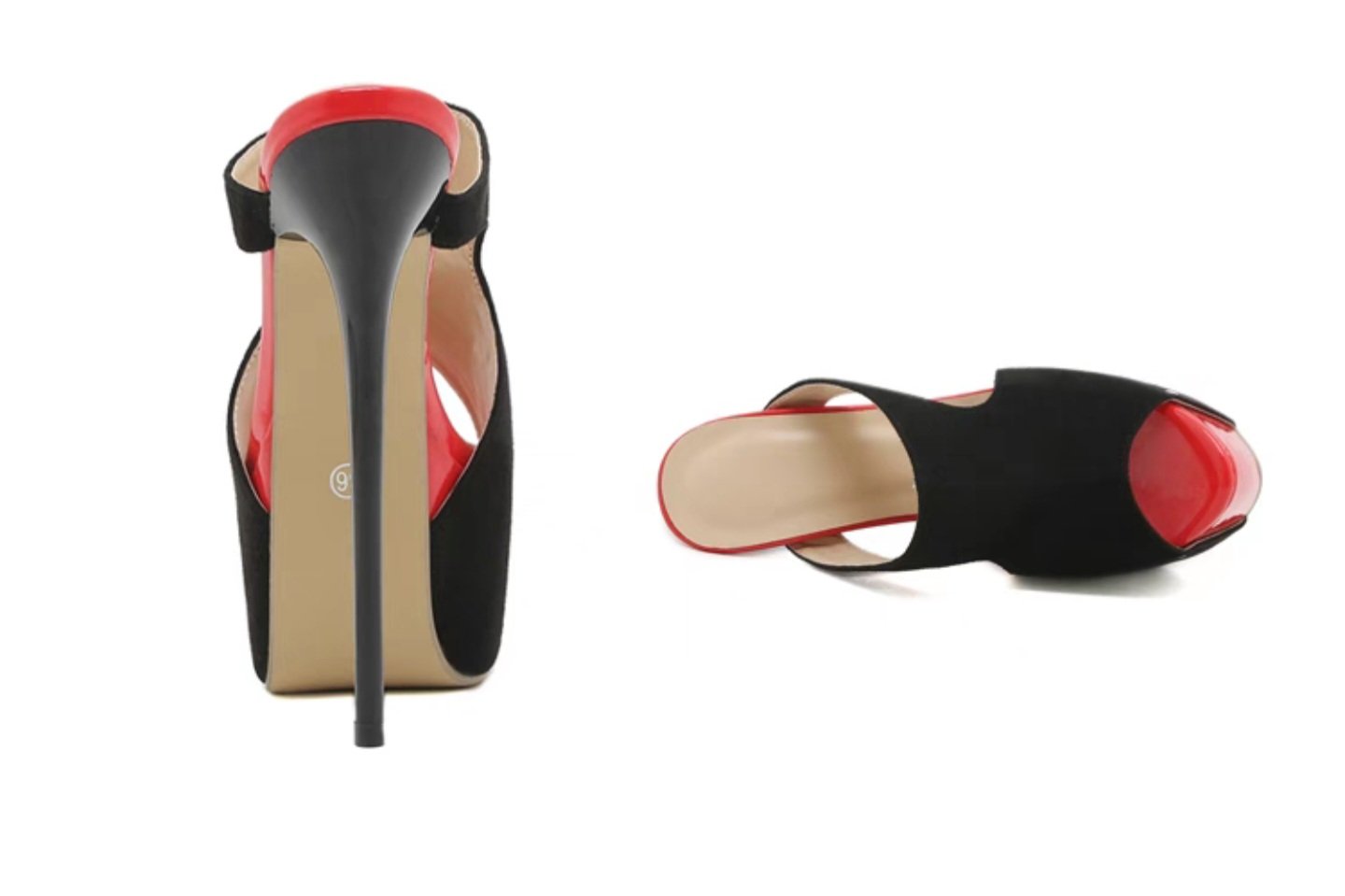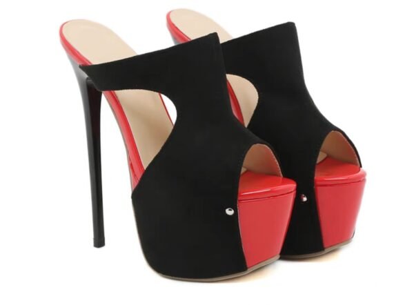 Black and red platform heel sandal with suede and shiny PU leather design.