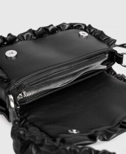 Playful and feminine unique rectangular handbag with frills and pleats around its edges for a fun and stylish touch.